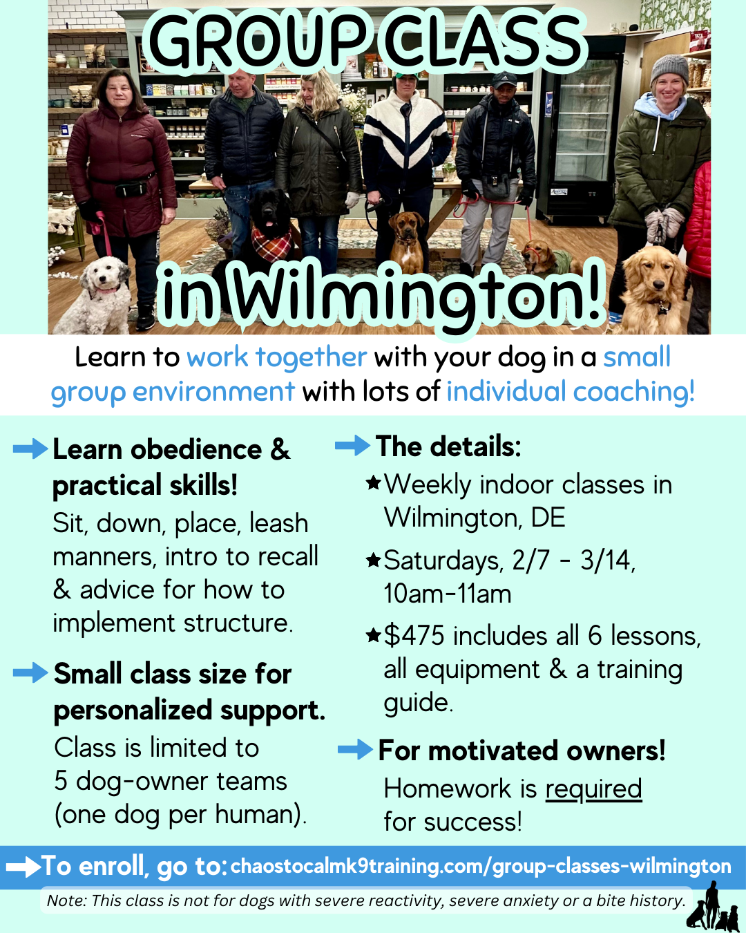 Now with several years of successful group classes in Newark, I am proud to bring this program to Wilmington to help even more people & their dogs.